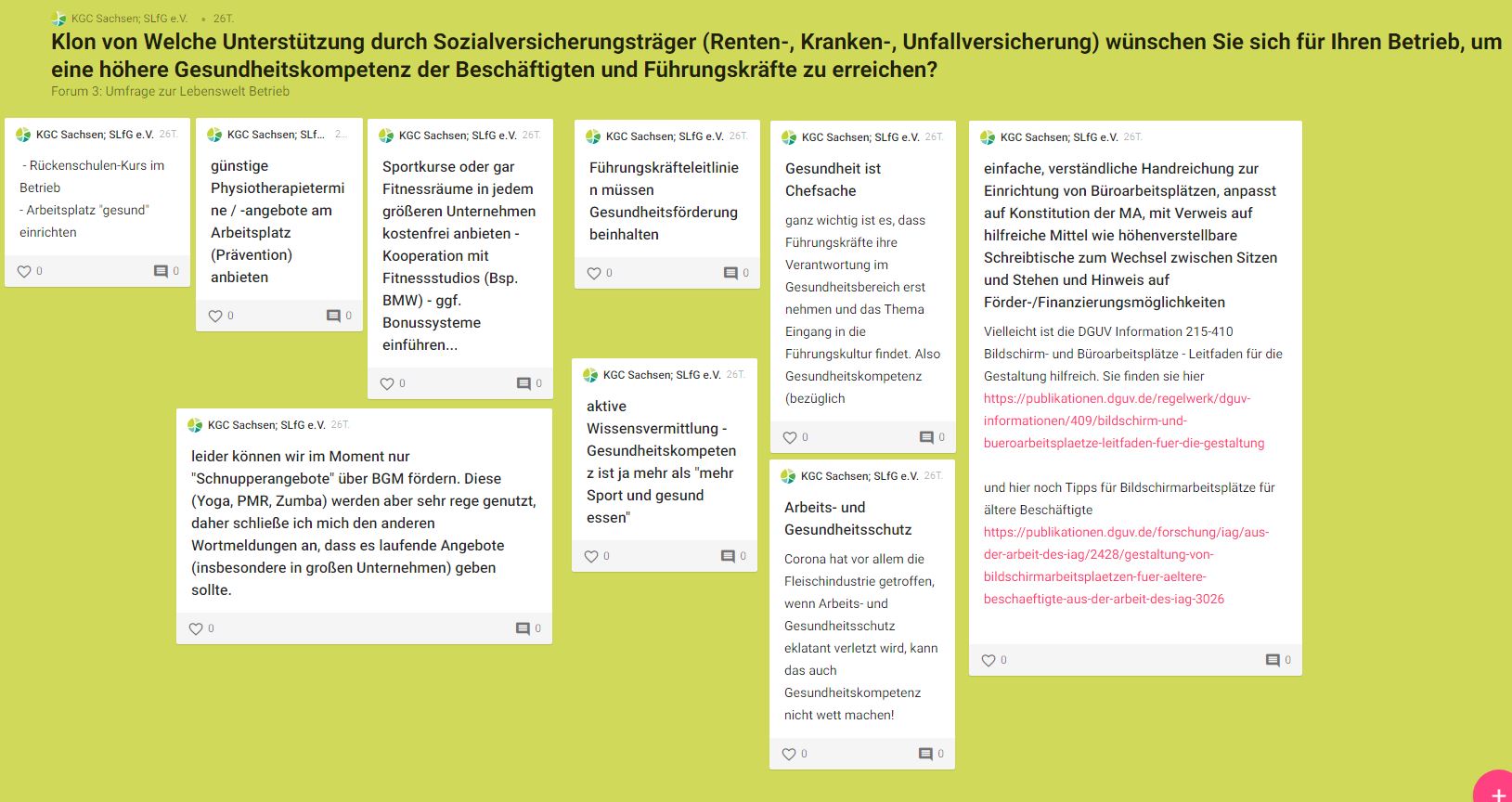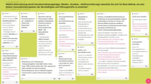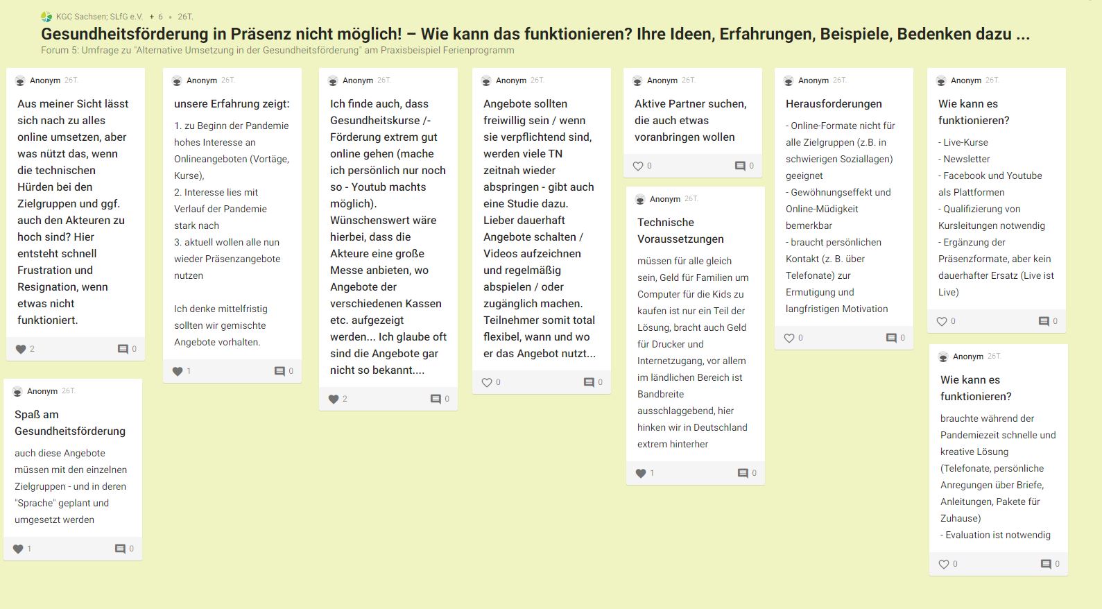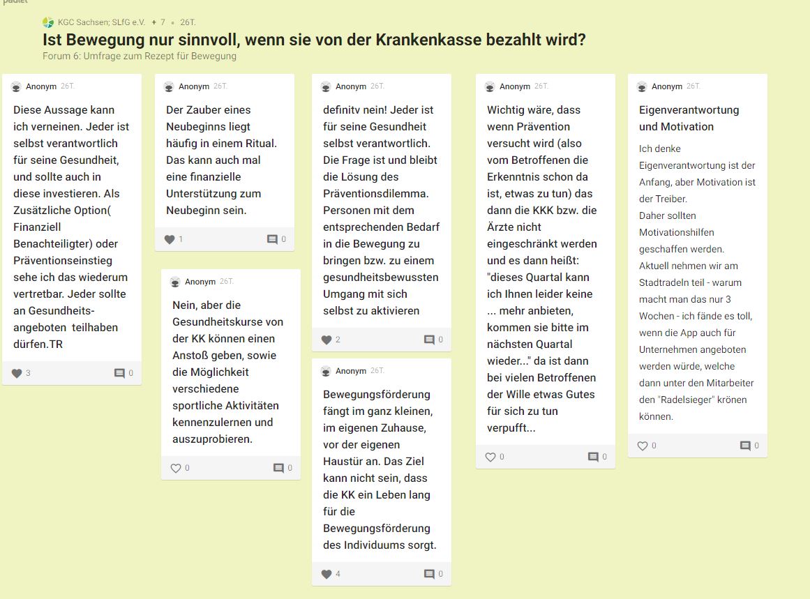 Am Nachmittag konnten sich die Teilnehmerinnen und Teilnehmer an fünf digitalen Messeständen informieren und in sechs Fachforen austauschen. Hier erhielten sie Impulse aus den einzelnen Lebenswelten und konnten ihre Erfahrungen einbringen. So wurde beispielsweise im Bereich „Gesund aufwachsen“ der aktuelle Prozess zur Qualitätsentwicklung von Gesundheitsförderung und Prävention in der Lebenswelt Schule aufgezeigt und diskutiert. Praxisbeispiele zur Gesundheitsförderung stellten u. a. die Stadt Leipzig mit „Präventiven Hausbesuchen“ und der Sächsische Sportärztebund e. V. mit dem „Rezept für Bewegung“ vor.