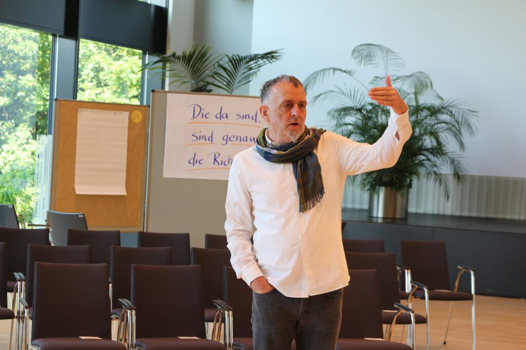 Den Tag über durch Norbert Poppe vom TRANSFORMHAUS begleitet, entwickelte sich von Beginn an eine eigene Dynamik. Kurz begrüßt wurden die Teilnehmenden durch Peter Voigt, den stellvertretenden Vorsitzenden des Steuerungsgremiums P. SACHSEN. Drei Fragen zur eigenen Arbeitsaufgabe und zu den Erwartungen an die Veranstaltung in Zweiergruppen besprochen, sorgten für ein erstes Kennenlernen und Warmwerden. Kaum jemand aus dem Teilnehmendenkreis hatte vorher einen Open Space besucht – und doch ließen nach dem Erläutern der Formatregeln die Fragen an das Plenum nicht auf sich warten. Schnell füllte sich die Anliegenwand und das Programm der Fachkonferenz fand seine Struktur.