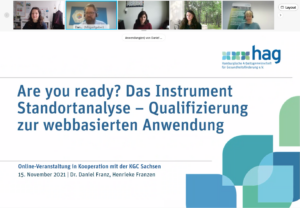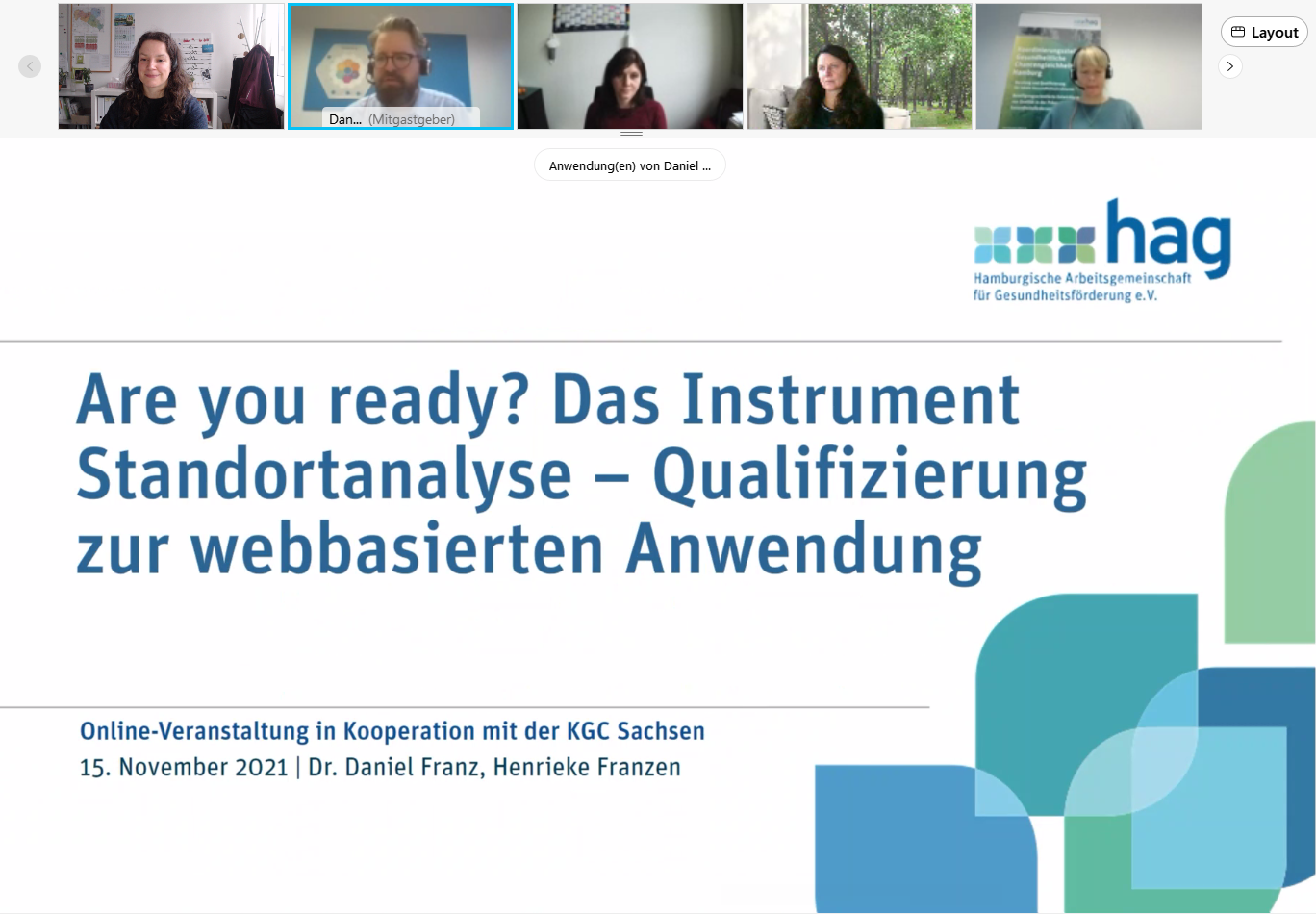 Are you ready? – „Ja!“ antworteten am 15. November 2021 zehn Gesundheitsförderinnen aus sächsischen Kommunen und Landkreisen und wagten einen Blick über den Tellerrand. Dr. Daniel Franz und Henrieke Franzen von der Koordinierungsstelle Gesundheitliche Chancengleichheit (KGC) Hamburg in Trägerschaft der Hamburgischen Arbeitsgemeinschaft für Gesundheitsförderung e. V. (HAG) stellten in einem vierstündigen Online-Seminar ihr Instrument Standortanalyse vor.