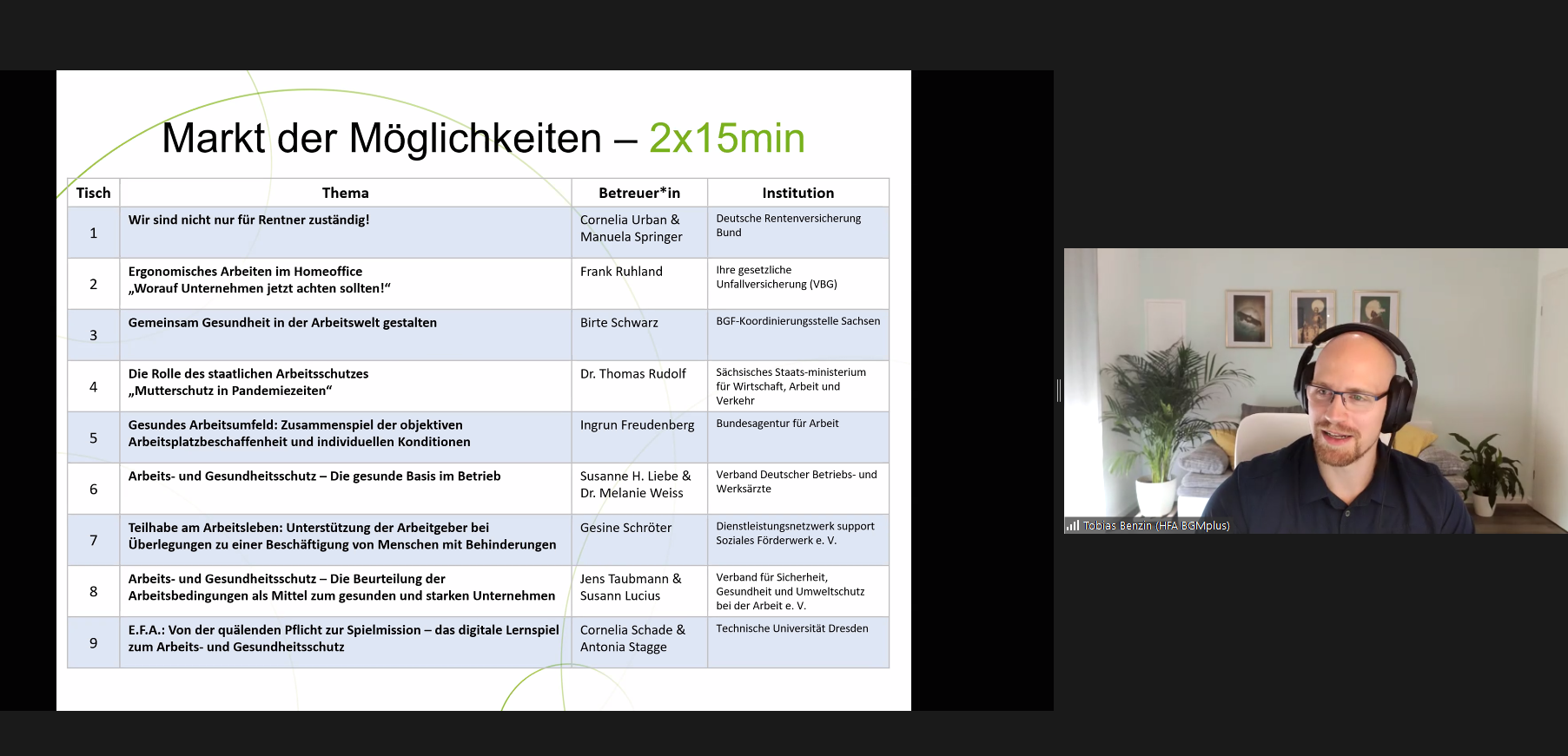 Infolge der weiterhin bestehenden Pandemiesituation beschloss die AG Betrieb Anfang des Jahres die regionale Veranstaltungsreihe „Gesunde Beschäftige – Starke Betriebe. Gemeinsam für gesunde Arbeit in Dresden“ für die Zielgruppe der KMU (Kleine und Mittlere Unternehmen) und der betrieblichen Multiplikator*innen in den digitalen Raum zu transferieren.