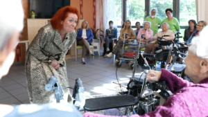 Im Anschluss nahm Demenzerzählerin Katharina Randel die Anwesenden mit auf eine märchenhafte Reise zu „Rumpelstilzchen“. Man konnte in den Gesichtern der Bewohnerinnen „ablesen“, dass viele Erinnerungen stimuliert und wach wurden.