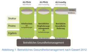 Hier kann das Betriebliche Gesundheitsmanagement (BGM) ansetzen. Es besteht aus den drei Handlungsfeldern Arbeitsschutz, Betriebliches Eingliederungsmanagement (BEM) und Betriebliche Gesundheitsförderung (BGF) – siehe Abbildung. Dabei soll Erkrankungen und Unfällen am Arbeitsplatz vorgebeugt, Gesundheitspotentiale sollen gestärkt und das Wohlbefinden am Arbeitsplatz gesteigert werden.