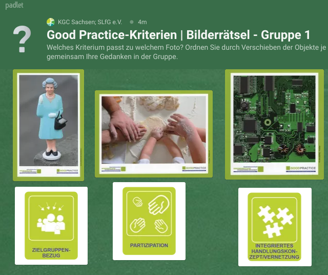 Einen ersten kreativen Zugang zu den Good Practice-Kriterien erhielten die Teilnehmenden in Form eines Bilderrätsels auf einer digitalen Pinnwand. Hierbei bemerkten die meisten, wie unterschiedlich oder ähnlich die Gedankenverknüpfungen und das Verständnis bezüglich der Kriterien waren. Dieser erste Teil der Auseinandersetzung wurde mit einem inhaltlichen Input zum Good Practice-Ansatz (Hintergründe und Vorstellung der Kriterien) abgeschlossen. Nach einer Mittagspause ging es anhand eines Praxisbeispiels auf „Schatzsuche“. Leitende Fragen waren dabei: Welche Kriterien wurden bei der Umsetzung des Projektes am stärksten oder weniger berücksichtigt? Wie wurden sie umgesetzt? Wo besteht Entwicklungspotential?