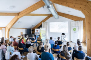 Die Mittagspause im schattigen Hof des riesa efau mit seinen Hochbeeten nutzten die Teilnehmenden zu einem regen fachlichen Austausch, bevor anschließend zwei Workshops zu einer intensiveren Auseinandersetzung mit verschiedenen Aspekten der Klimaauswirkungen einluden.
