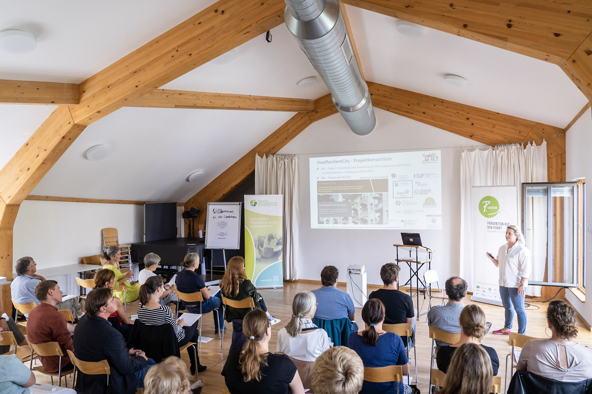 Den Blick in die und aus der Praxis gewährte Marit Gronwald vom Amt für Gesundheit und Prävention der Landeshauptstadt Dresden, die den Multiplikator*innen den Quartiersansatz des Projekts „HeatResilientCity II“ vorstellte. Aus dem dabei entstandenen Hitze-Handbuch präsentierte sie für die Risikogruppe der Senior*innen wichtige präventive Maßnahmen und Handlungsempfehlungen in akuten Hitzephasen.