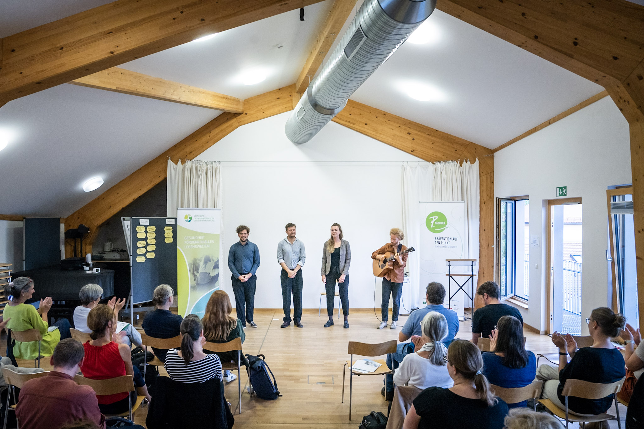 Am Ende der Workshops notierten die Teilnehmenden ihre Essenz des Tages. Daraus schufen die Spieler*innen des Improtheaters „Yes oder Nie“ Spielszenen, die mit einer Mischung aus Humor, Tiefgründigkeit und Ernst das Thema Klimakrise aus künstlerischer Perspektive beleuchteten.