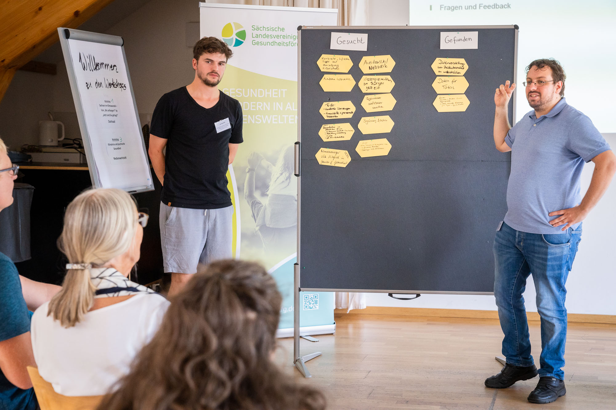 Im vertiefenden Workshop „Sachsen im Klimawandel“ gingen Dominic Rumpf und Jan Borcholt vom Fachzentrum Klima des LfULG auf die oft gestellte Frage „Wo anfangen?“ ein. Sogenannte Klima-Coaches sollen Kommunen in Zukunft unterstützen. Wie so etwas aussehen kann, stellten sie anhand von ganzheitlich geplanten Klimaanpassungsmaßnahmen im sächsischen Lauta vor, das von starker Trockenheit betroffen ist. Hilfreich war ebenso der Verweis auf interessante Fördermöglichkeiten durch Bund und Land. Die Teilnehmenden hielten es für wichtig und notwendig, die regionalen Klimadaten kurzfristig auszuwerten und den Bürger*innen nahezubringen, um ein Bewusstsein für deren eigene Gefährdung zu schaffen. Zudem müssen Mitstreiter*innen gefunden und Netzwerke gebildet werden, die dafür sorgen, dass die Themen Klima und Gesundheit in allen Entscheidungen der Kommunen mitgedacht werden.