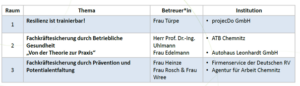 In den anschließenden drei Workshops wurden einzelne Themenschwerpunkte vertieft. Workshop 1 widmete sich den Ansätzen zur Gesunderhaltung durch die Stärkung individueller Resilienzfaktoren.