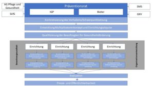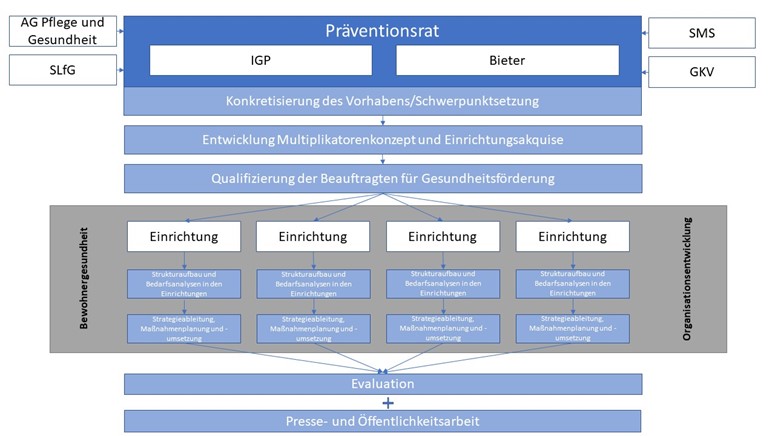 Im Fokus dieses Vorhabens steht ein partizipativer und bedarfsorientierter Prozess, der die individuellen Anforderungen der Einrichtungen bestmöglich berücksichtigt. Bis zu zwei Personen pro Einrichtung werden als Gesundheitsförderungs- und Präventionsbeauftragte qualifiziert, um eine nachhaltige Gesundheitsförderung zu erreichen. Sie erhalten Schulungen in den Bereichen Gesundheitsförderung, Organisationsentwicklung, Moderation und psychosoziale Gesundheit. Die Beauftragten werden einen Steuerkreis bilden oder bestehende Strukturen erweitern, um bedarfsorientierte Angebote für Bewohner*innen und Personal zu entwickeln. Um sicherzustellen, dass der Prozess reibungslos verläuft, werden externe Prozessberater*innen die Beauftragten bei der Umsetzung der Gesundheitsförderungsmaßnahmen unterstützen.