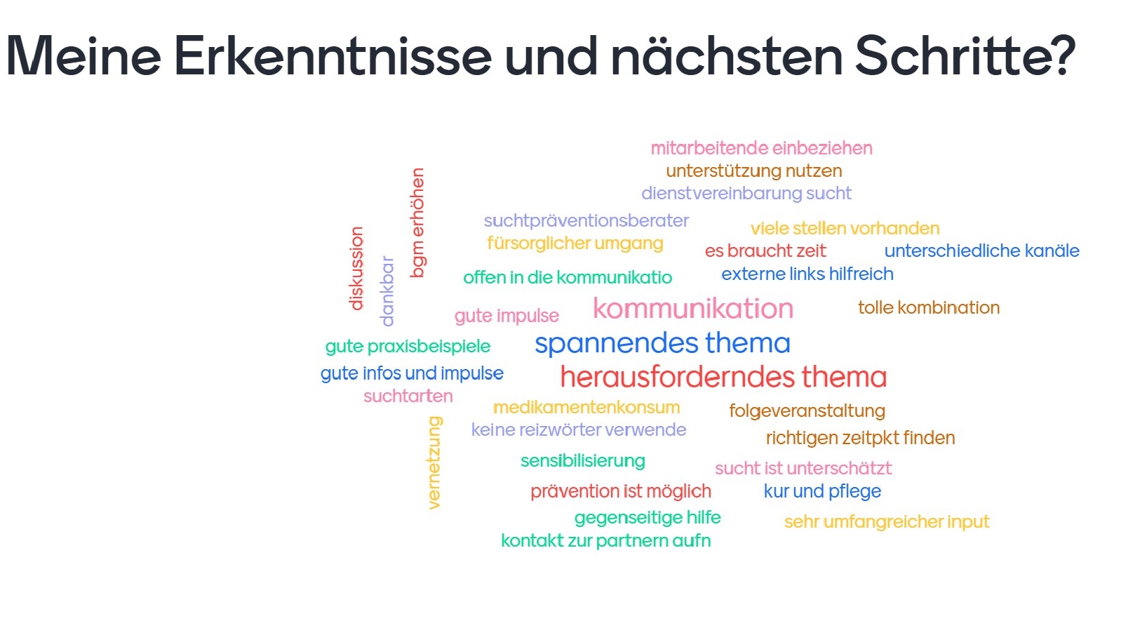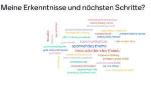 Eine Wortwolke (beim Klicken auf das Bild wird es vergrößert) sammelte zum Abschluss die gewonnenen Erkenntnisse und nächsten Schritte der Teilnehmenden: