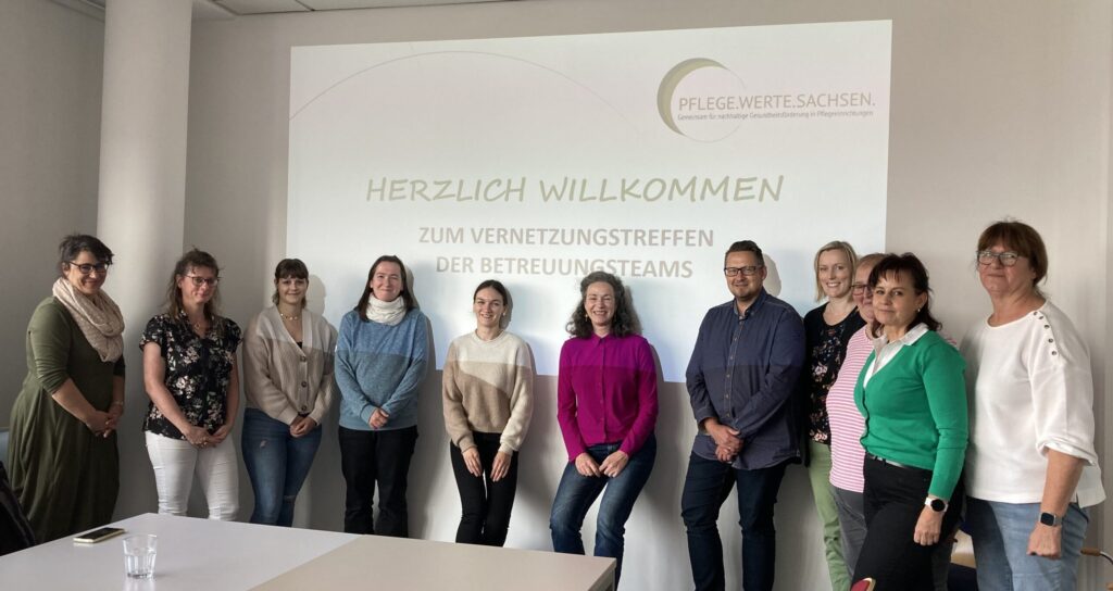 Am 18. Oktober 2024 trafen sich zehn engagierte Betreuungskräfte aus den vier am Modellvorhaben PFLEGE.WERTE.SACHSEN. teilnehmenden Einrichtungen zu einem persönlichen Vernetzungstreffen in Dresden. Ziel dieses Treffens war es u. a., sich zu aktuellen Herausforderungen des Berufsalltags auszutauschen, voneinander zu lernen und gemeinsam Lösungen zu entwickeln.